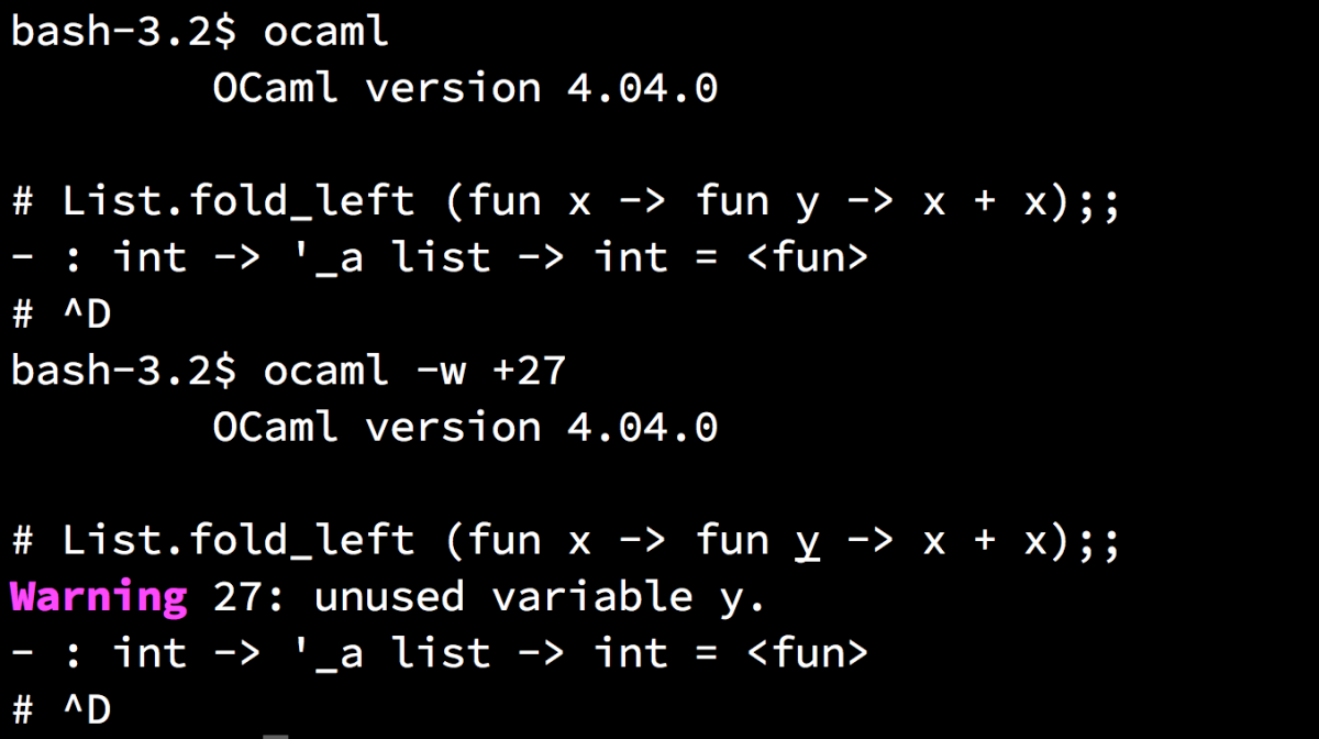 OCaml において,以下のような場合は未使用変数の警告が出ますが, $ ocaml OCaml version 4.04.0 # let x = 1 in 1;; Warning 26: unuse…